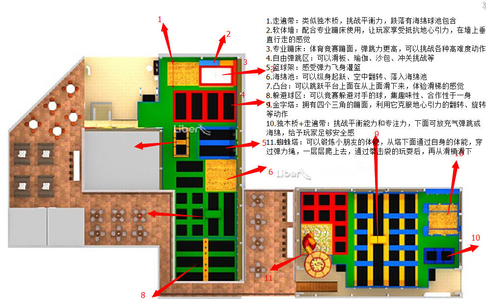 蹦床根据不同的年龄可设计不同的功能区域,最普通的是自由弹跳区域,还有躲避球区域,蜘蛛塔区域,专业蹦床等各种不同区域,这些区域可根据客人要求设计布局